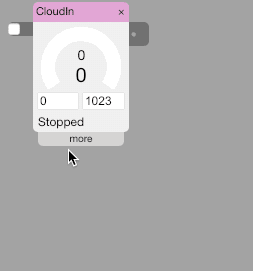 The CloudIn widget periodically retrieves numeric data from cloud services such as data.sparkfun.com and particle.io. This data is typically published by another device. Because cloud services limit the frequency of data accesses, the widget waits for a set period between each access (10 seconds by default).