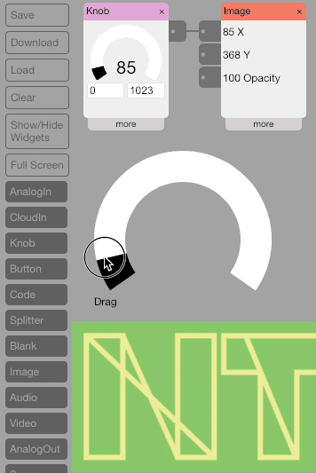 The Knob widget creates an on-screen round dial that when clicked or touched, outputs a value corresponding to the position on the dial.