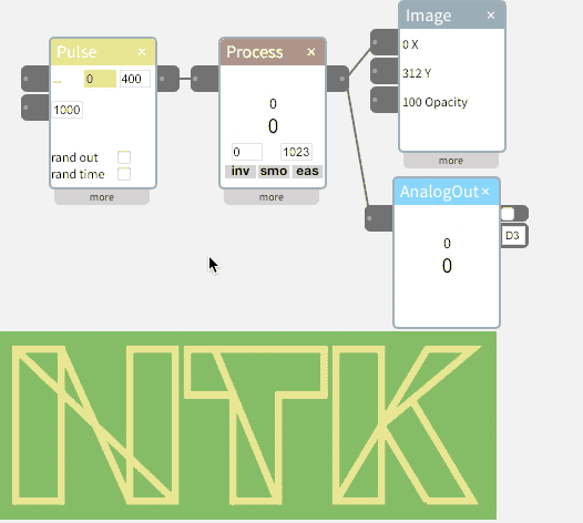 The Pulse widget outputs values periodically. By default, it momentarily sends a high (e.g. 1023) value every second (returning to a low value such as 0, 90 milliseconds later). In addition to using fixed amounts for the pulse period and output values, these can be set to random values.