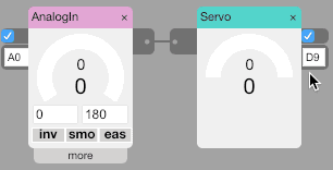 Servo Set the position of a servo The Servo widget sends values to a device port to set the position of a servo motor. Servos can normally rotateĀ 180 degrees, and the widget accepts values from 0 – 180 corresponding to the position of the servo.