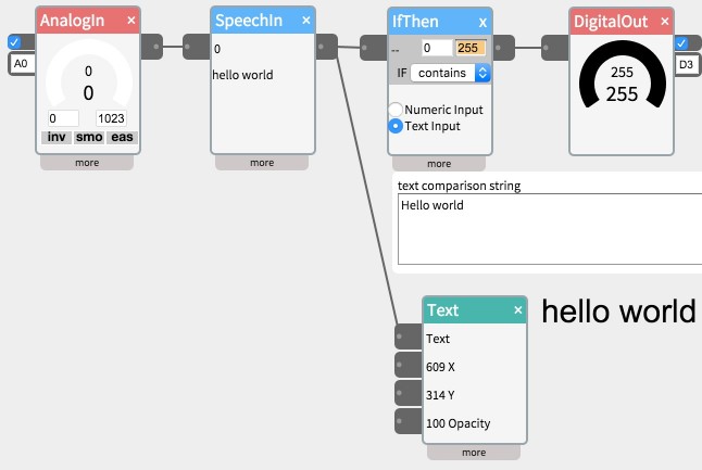 The SpeechIn widget performs speech recognition and outputs text. It supports multiple languages. Currently only works in the NTK app, and in Google Chrome in the Command Line version of NTK.