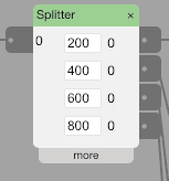 Splitter converts a single input into up to four outputs. For example, a knob sensor can turn on LEDs in sequence, where each LED get bright at a different value of the input. As the knob goes from zero to 1023, the LEDs will light up at 200, 400, 600 and 800. These “center points” can be set to any value on the main widget interface. In the more section, the range above and below this center point can be set, as well as the minimum and maximum values for the outputs.
