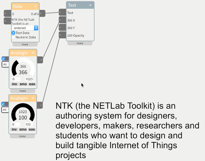 The Text widget displays text on the screen. It accepts text from another widget like the Data widget. Inputs are also available to control the X position, Y position, and opacity of the text. You can drag the text anywhere on the screen, and until an input value changes the location, the text will stay there.