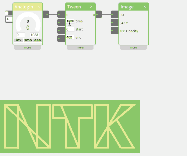 The Tween widget outputs a smooth stream of values that transition between two numbers, in a set time. This can create a natural fluid motion for graphics, motors, sound volume or any other output. Optionally, the widget can output a sequence of tweens to create more complex changes in the output (e.g. 0->500, 500->100, 100->1000,1000->0). Tweens and sequences can optionally loop.